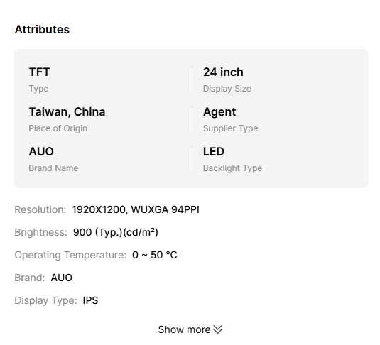 Key attributesTypeTFTDisplay Size24 inchPlace of OriginTaiwan, ChinaSupplier Typ